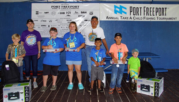 Port Freeport Executive Director/CEO Phyllis Saathoff and Port Commissioner Rudy Santos presents 1st place through 3rd place awards to tournament winners in blue fins and yellow fins divisions.
