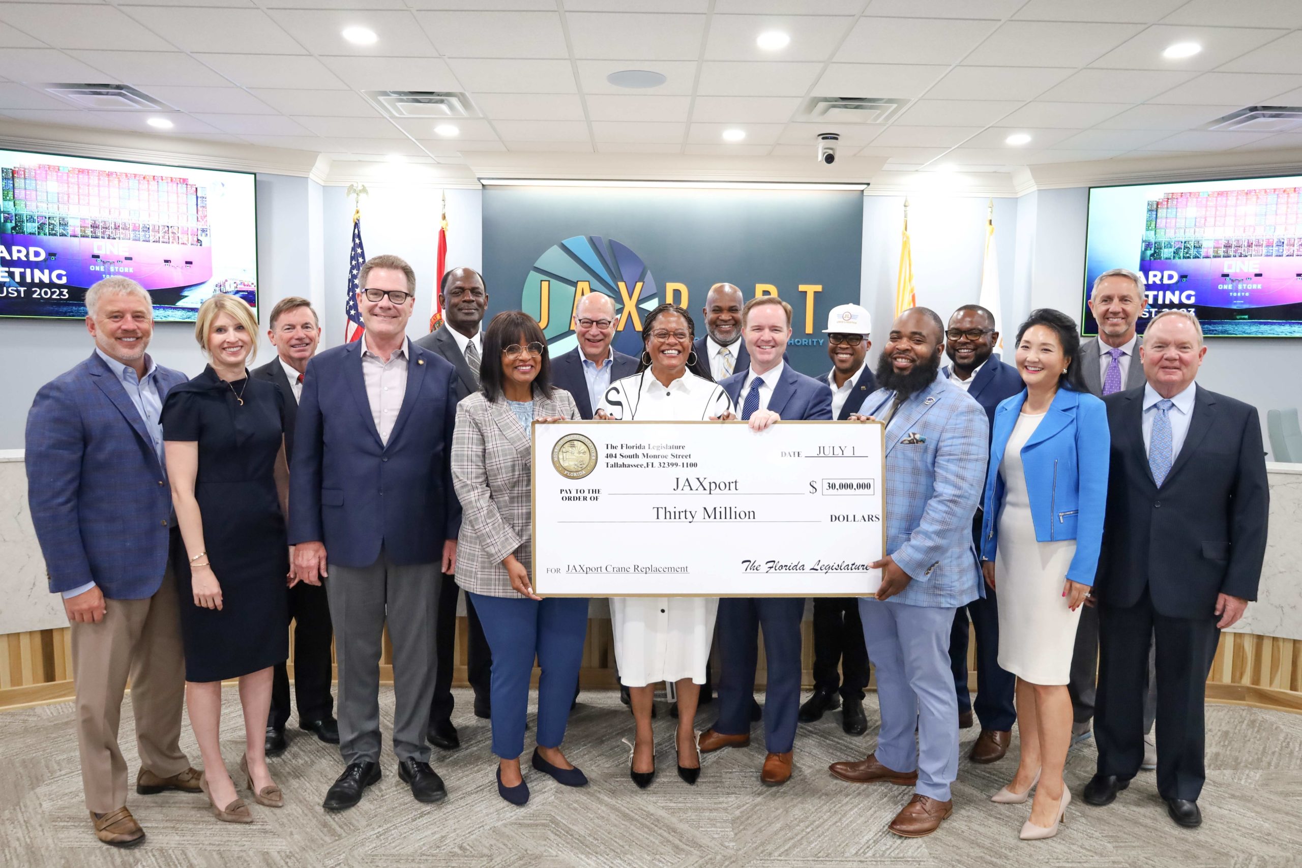 Florida Legislators presented JAXPORT with a $30 million check during the port’s monthly Board of Directors meeting on August 28. The funding will be used to purchase two new container cranes for the port’s Blount Island Marine Terminal.The new cranes will increase JAXPORT’s cargo handling efficiencies, allowing more cargo to move through the port. As cargo-handling infrastructure expands, it ensures JAXPORT can continue to meet the growing cargo volume needs ...