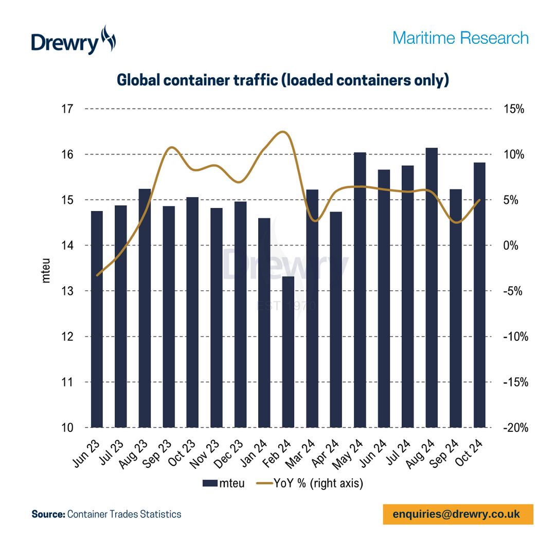 [ December 13, 2024 // Gary G Burrows ]Loaded container traffic improved 5 percent year-over-year in October, according to the latest data update from Container Trades Statistics Ltd., or CTS.