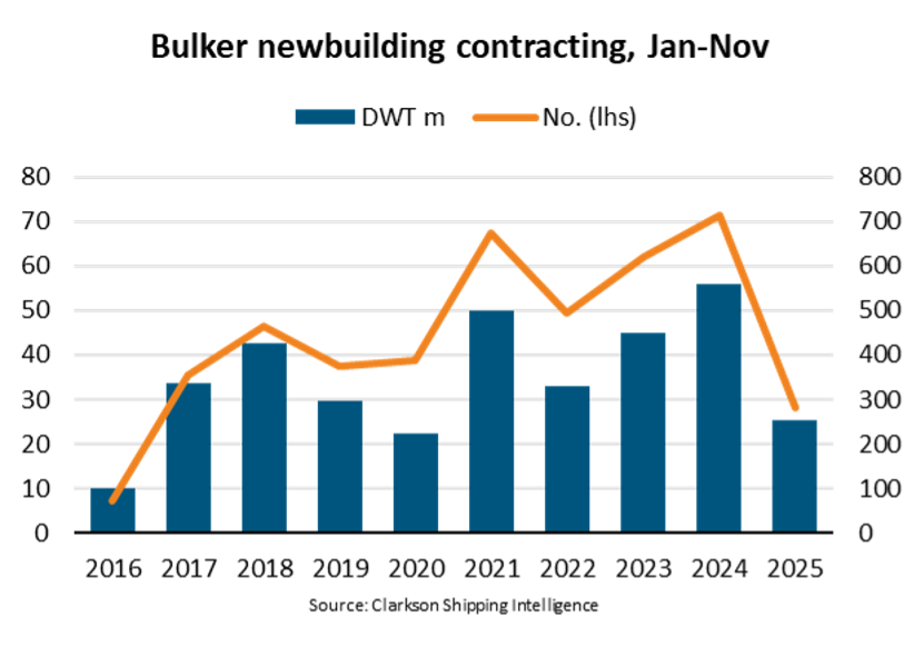 [ December 8, 2025 // Gary Burrows ]Through November the capacity of bulker newbuilding contract fell 54 percent year-over-year to 25 million deadweight tons, its lowest level since 2020, said BIMCO, the Danish shipping association.