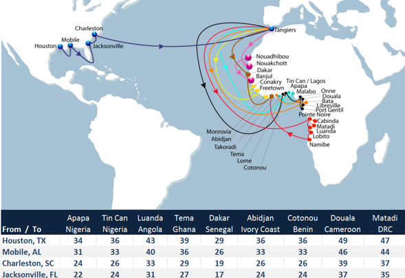 The service includes new weekly calls at Charleston, Mobile and Jacksonville in addition to the current call at Houston to West Africa with competitive transit times; shortened transit time up to 6 days from Houston, and increased service reliability for cargo to West Africa North range as the transshipment is reduced to one in Europe instead of two. Apapa (Nigeria) is now reached in 34 days, Luanda (Angola) in 34 days with a weekly frequency, Pointe Noire (Congo) in 40 days, Tema (Ghana) in 39 days.