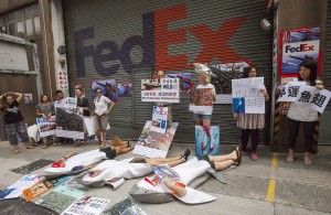 Wildlife activists from WildAid and Hong Kong Shark Foundation stage a bloody protest outside a FedEx depot to draw attention to FedEx’s continued shark fin shipments into Hong Kong which is the global hub of the shark fin trade with over 50 percent of the trade passing through the city, Kennedy Town, Hong Kong, China, 03 July 2016. The activists dressed in blood-stained shark costumes and held placards calling on FedEx to stop shipping shark fin and laid down silently on the ground.