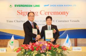 [ February 26, 2018 // Gary G Burrows ]Evergreen Marine Corp. (EMC) has entered into an agreement with Shoei Kisen Kaisha today to charter twelve 11,000 TEU class containerships. The charter parties were signed by EMC Chairman Anchor Chang and President of Shoei Kisen Kaisha Yukito Higaki.