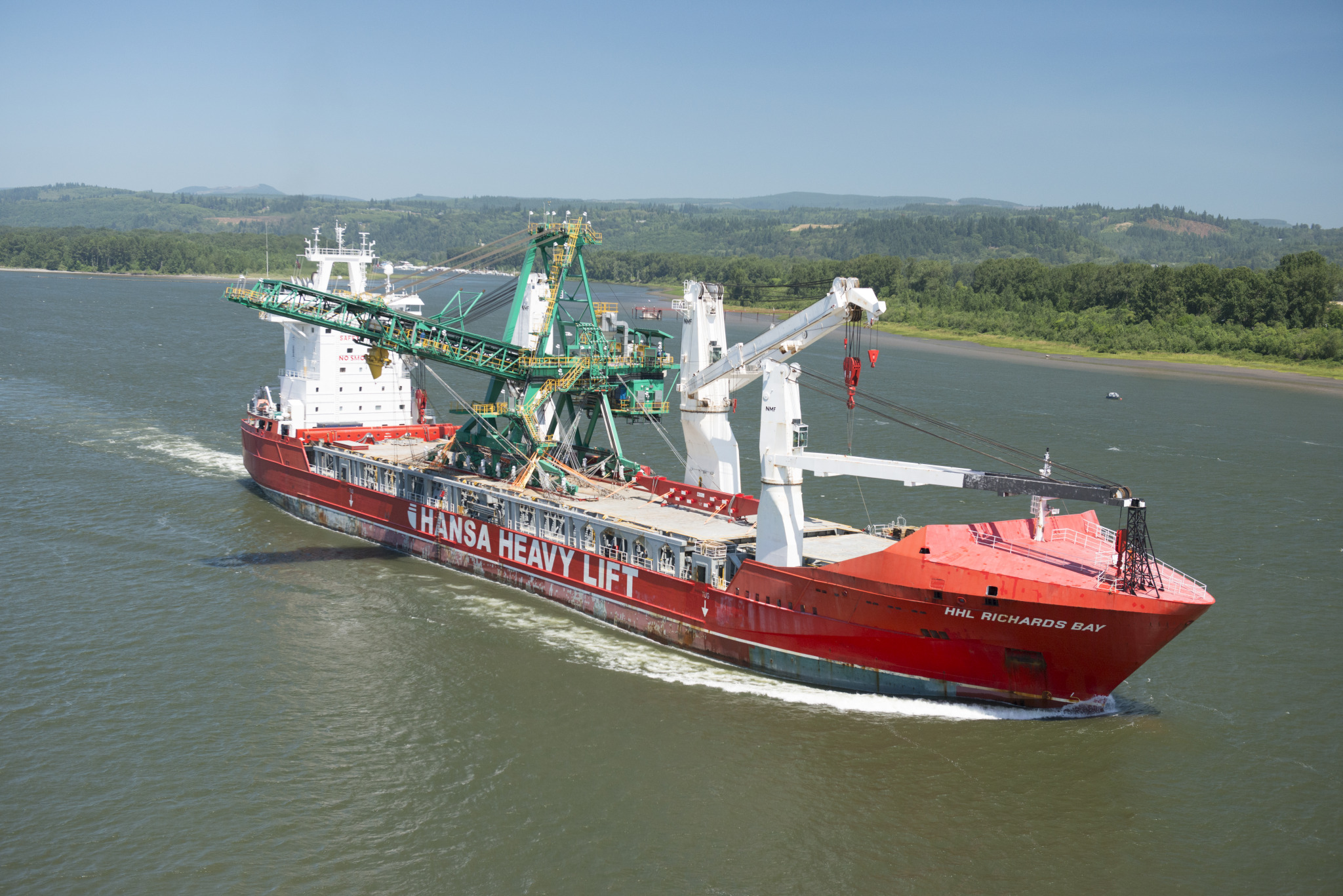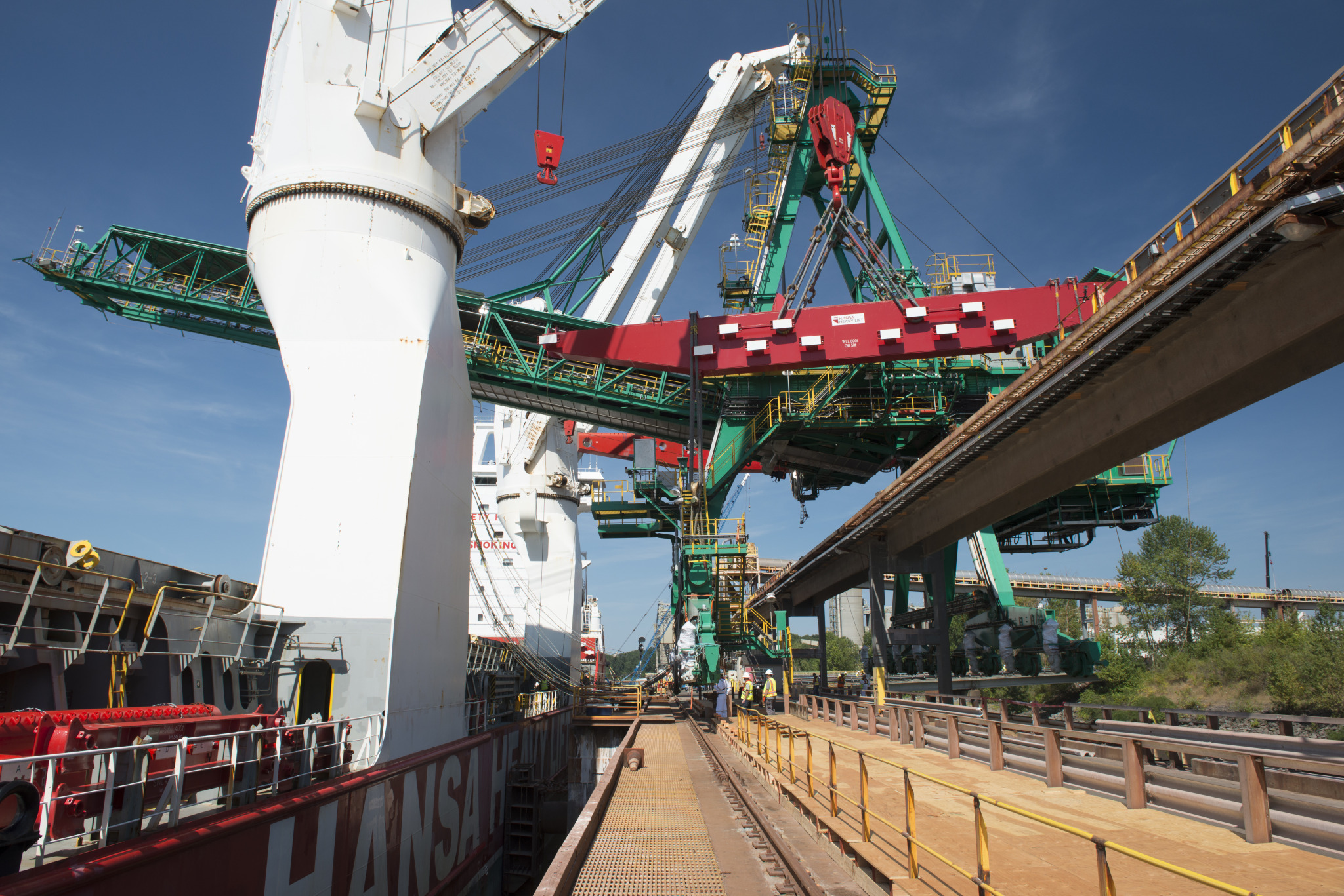 [ August 26, 2015 // Gary G Burrows ]Hansa Heavy Lift has successfully transported a shiploader weighing over 560 metric tons from Nantong/China to Portland, Oregon/USA for Sandvik Mining and Construction. HHL Richards Bay safely transported the shiploader, which measures 36.50 meters in length x 56.44 in width x 31.50 in height, discharging it at the Port of Portland where engineers installed it onto the pier. “The biggest challenge was to lift the shiploader over the conveyor rail at the Port of Portland, whilst ensuring neither sustained damaged,” said Gareth Hamer, Head of Cargo Management, Americas, HANSA HEAVY LIFT. “We then completed the installation of the tripper car and portal under the direction of Sandvik. “The discharge operation took place over five days and required detailed planning, as well as close cooperation with all parties involved.” HANSA HEAVY LIFT engineers used three lifting beams to move the shiploader on and off the vessel at each port, as it only had lifting trunnions on one side. The size of the cargo and narrow width of the pier meant that the third lifting beam had to be lowered onto a barge after the discharge operation was completed.