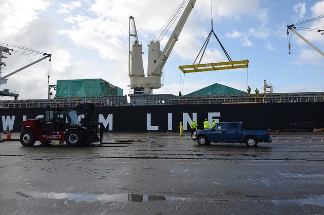 [ May 4, 2016 // Gary G Burrows ]Highly trained master riggers recently moved 42 large steel pieces that will ultimately form a Northeast Florida manufacturing facility. The cargo moved through the heavy lift and specialty cargo berth at JAXPORT’s Blount Island Marine Terminal, home of one of the nation’s highest weight-bearing capacity docks.