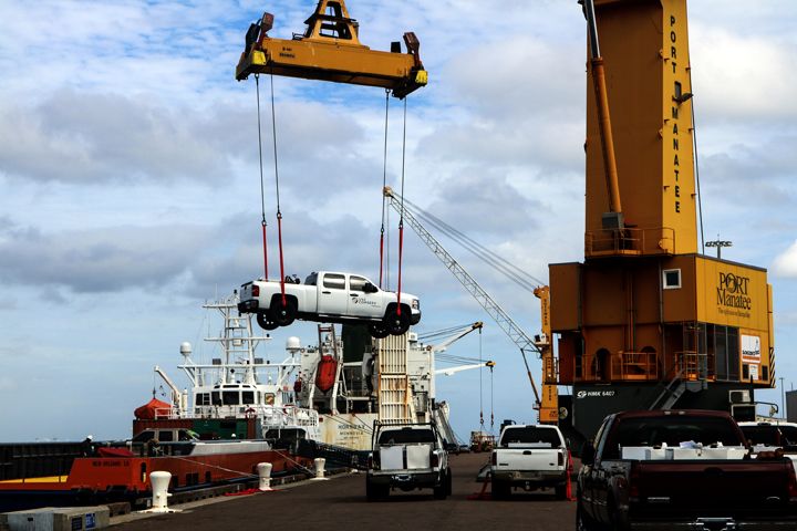 Seacor Marine LLC’s U.S.-flagged Liam J. McCall, a newly built aluminum fast support vessel, left Port Manatee carrying equipment including 10 work trucks, two generators and two containers of relief goods, as well as a dozen construction, maintenance and security workers.