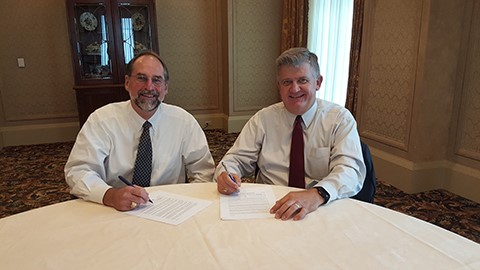 Freight Shuttle International Chairman and President, Dr. Steve Roop and Port of Houston Authority Executive Director Roger Guenther sign Memorandum of Understanding. (Photo: Business Wire)