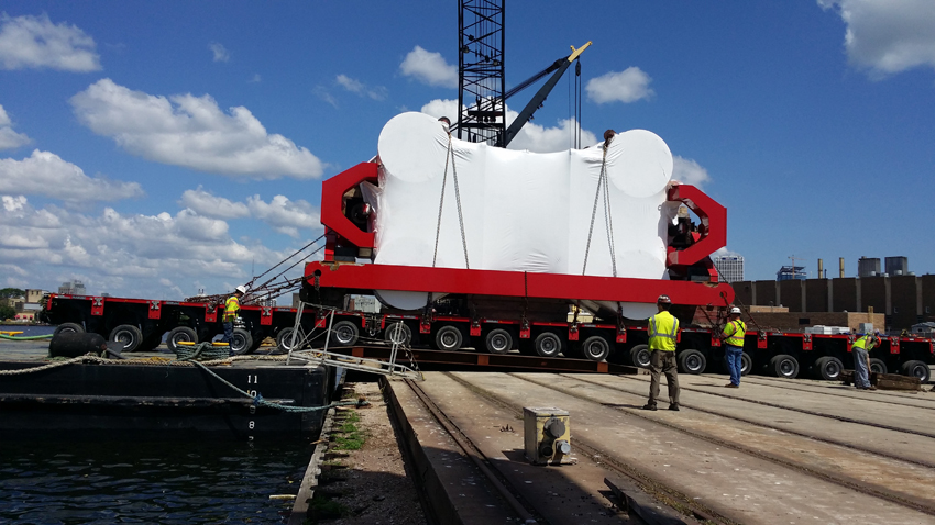 “Emmert International, a specialist in designing, engineering, and manufacturing the heavy-haul and rigging equipment used to perform many of the most massive and complex projects in the world chose the Port of Milwaukee to move an extraordinarily large piece of cargo in July,” said Jeff Fleming, Port spokesperson. Emmert arranged for the transportation of a 650,000 pound ‘platen’ to be moved from Canada on a deck barge through the Seaway System to Milwaukee. The platen then headed to Scot Forge in Spring Grove, Illinois via CP Rail which switches into the Port. Emmert relied on the Port’s heavy lift dock capability and their intermodal assets to serve their customer.