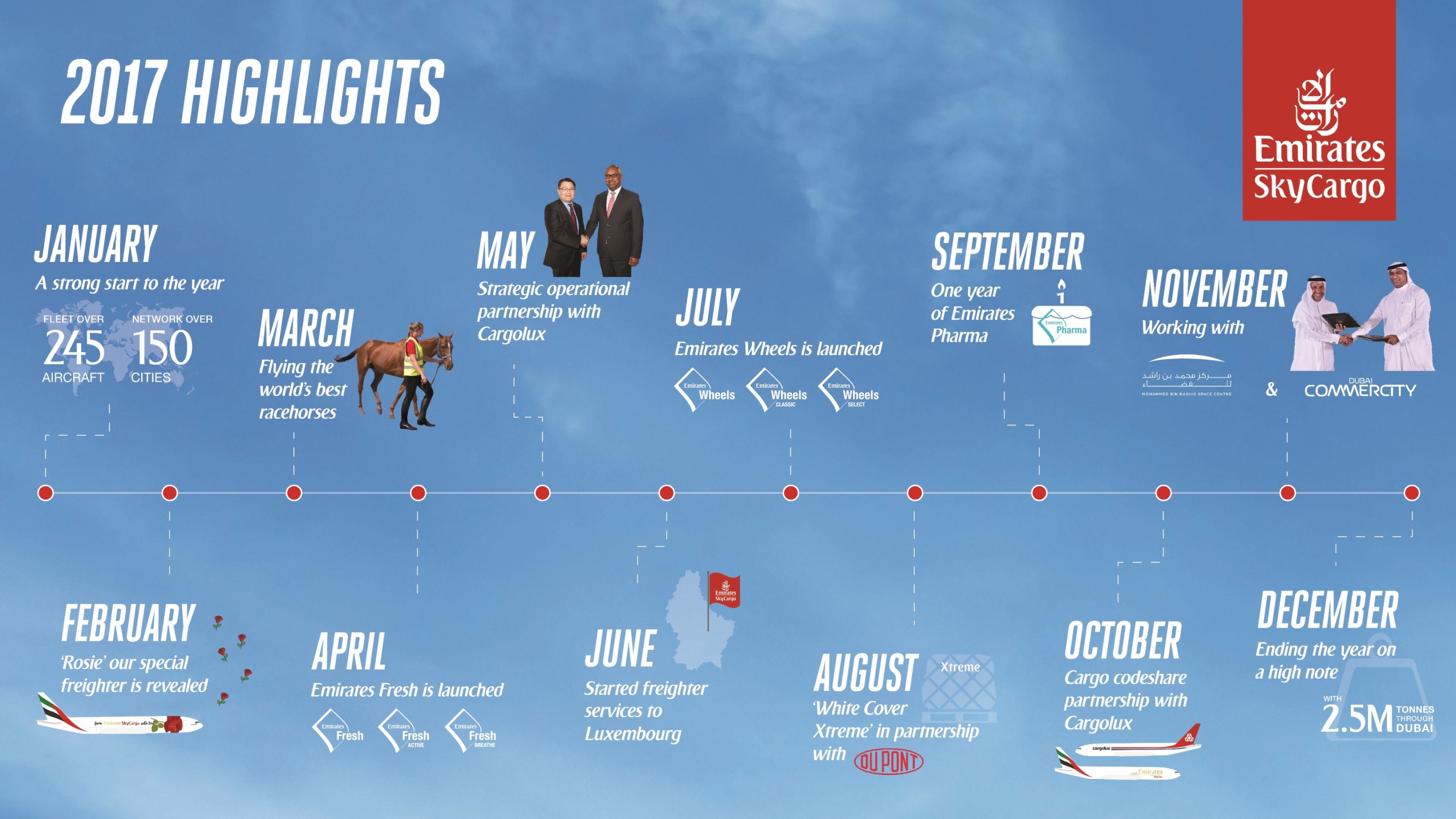 Between January and December 2017, Emirates SkyCargo’s hubs at Dubai International Airport (DXB) and Dubai World Central (DWC) saw a combined cargo throughput of over 2.5 million tonnes.