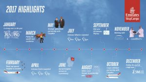 In addition to commencing scheduled freighter services to Luxembourg in June 2017, the air cargo carrier also increased frequency of freighter services to Hong Kong from 22 to 26 flights a week. Unique cargo transported onboard Emirates’ freighters included horses, luxury cars, boats, heavy equipment and aircraft engines.