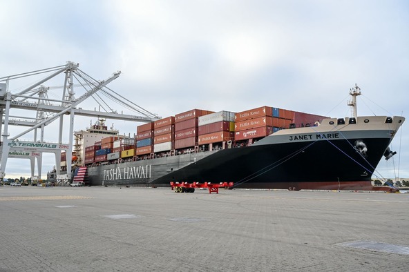 The Port of Long Beach welcomed the latest green container vessel to Pasha Hawaii's fleet, the MV Janet Marie.The Janet Marie, the company's second of two "Ohana Class" container ships powered by liquefied natural gas, made its maiden voyage early Saturday from Long Beach to its home port in Honolulu. ...