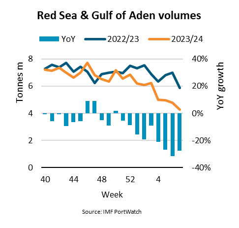 Cargo volumes to and from ports in the Gulf of Aden and Red Sea during the first seven months of 2024 declined 21 percent compared to the year-earlier period, according to BIMCO the international association for shipowners.“The number of ships arriving in these ports significantly declined as merchant shipping increasingly avoided transiting through the region due to concerns over attacks on ships by the Houthis,” said Niels Rasmussen, chief shipping ...