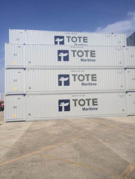 TOTE Maritime’s 53’ containers are custom made for both TOTE and Puerto Rico. These custom containers maximize space increasing capacity by 42 percent over a standard 40’ container. With this increased capacity, they also improve efficiency, reduce greenhouse gas emissions and reduce transportation costs for goods traveling to Puerto Rico.