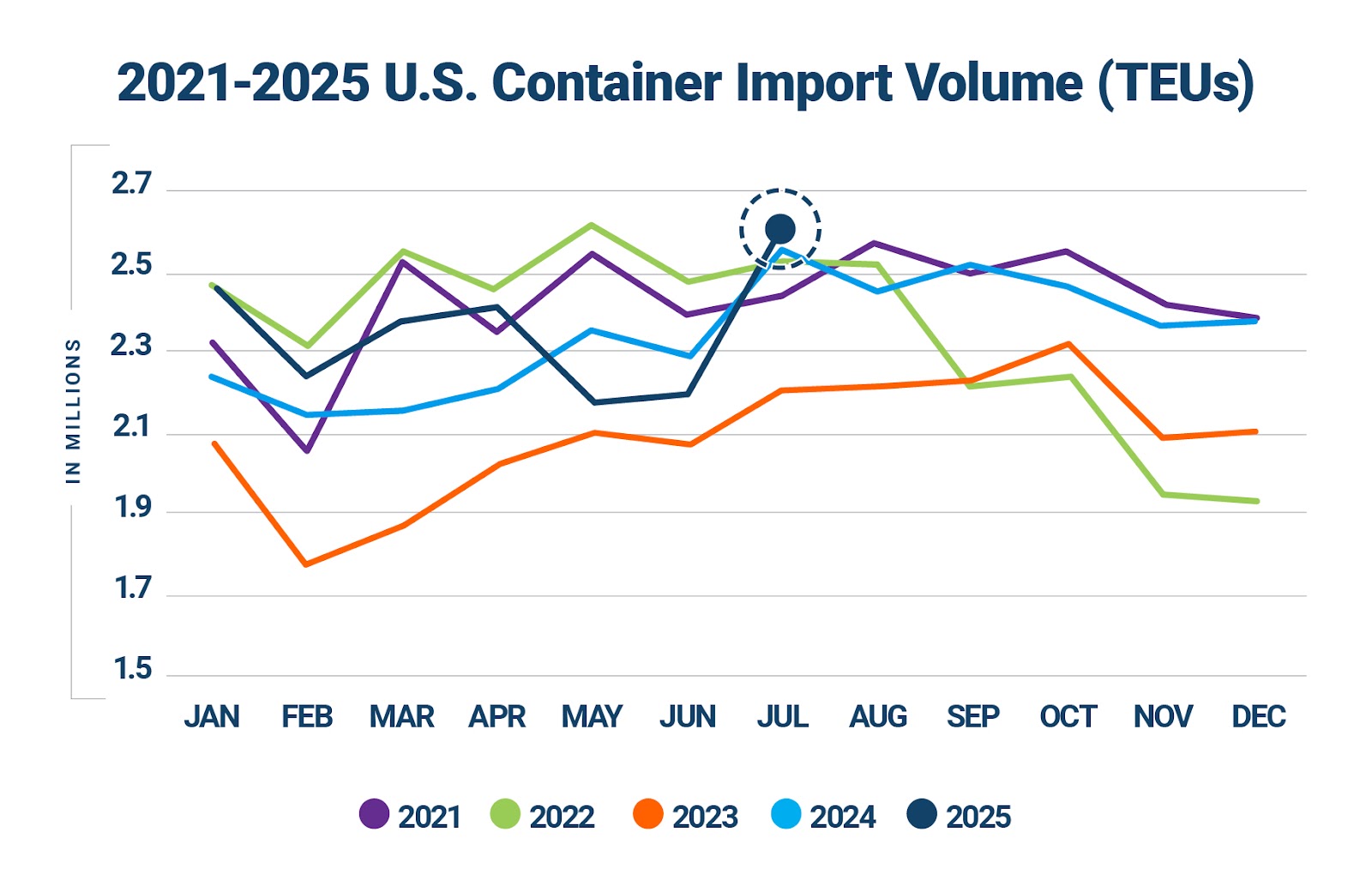 July was a busy month for U.S. containerized imports, following two months of uneven performance. Total volumes surged 18 percent over June to 2.62 million twenty-foot equivalent units (TEU). It’s also a 2.6 percent increase over July 2024 – and just 555 TEUs short of the record set in May 2022.