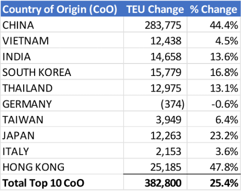 In addition to July’s month-over-month volume increase from China, U.S. imports from the top 10 countries of origin also shows a notable increase from Hong Kong (47.8 percent). Strong contributions also came from across Asia: South Korea (16.8 percent), India 13.6 percent), Thailand (13.1 percent), and Japan (23.3 percent), while Vietnam, Taiwan, and Italy posted more moderate gains. The widespread increases suggest a resurgence in Asia-origin shipments among U.S. importers.